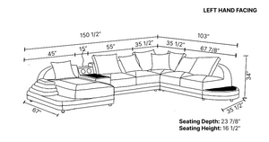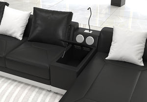 Its layout includes a versatile chaise lounge, a console with built-in Bluetooth speakers, an armless loveseat, a corner unit, and a left- or right-facing loveseat, giving it both style and flexibility to fit your living space needs. The LED-lit side platform adds ambient glow while the rounded edges keep the look soft and inviting.