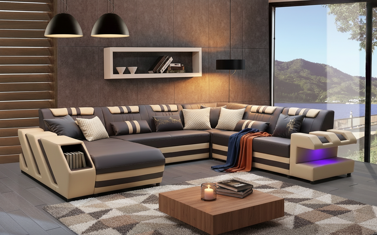 The Neptune Modern Leather Sectional with LED lighting is available in two-toned or contrasting colors in Italian leather and bonded leather. It features two storage spaces perfect for books or magazines. The side of this leather couch are illuminated by a LED light. It can be optionally upgraded to multi-color lights that can be controlled by a wireless remote. Each top headrest is adjustable. Choose your configuration left hand facing or right-hand facing chaise to customize to your desired design. This modern couch is a stylish and lively addition to your living space. The unique angular design on the sides of this sectional quickly catch the eye of visitors. To complete the look of your living space we recommend adding the ottoman and coffee table. Cup holders and USB ports are recommended for larger families to optimize maximum enjoyment. An additional bed function makes a great movie night with the family or space for unexpected guests. With the generous size of this sectional, family and friends will gladly socialize in comfort.